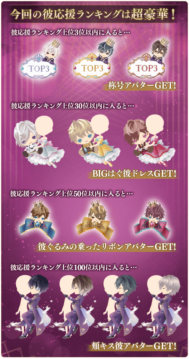 彼応援ランキング上位100位以内に入ると「頬キス彼アバター」がGETできる!