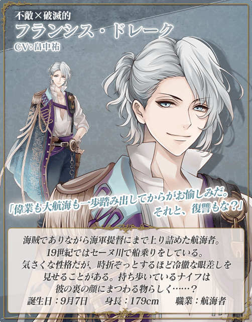 「日常を忘れるほどの激しい恋をしてもらいたい」という一心で、愛すべき15人の偉人たちと共に歩み続け、また、今年新たにガリレオ、ドレークの2人も加わり、6周年を迎えられたことを嬉しく思います。