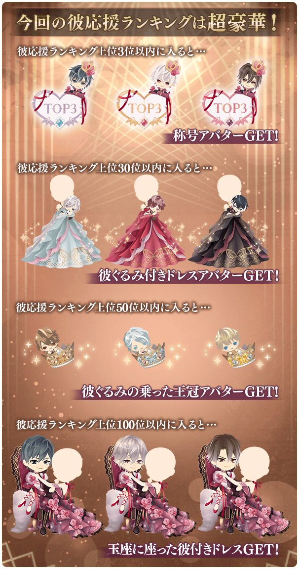 彼応援ランキング上位100位以内に入ると、超豪華な「王座に座った彼付きドレス」がGETできる!