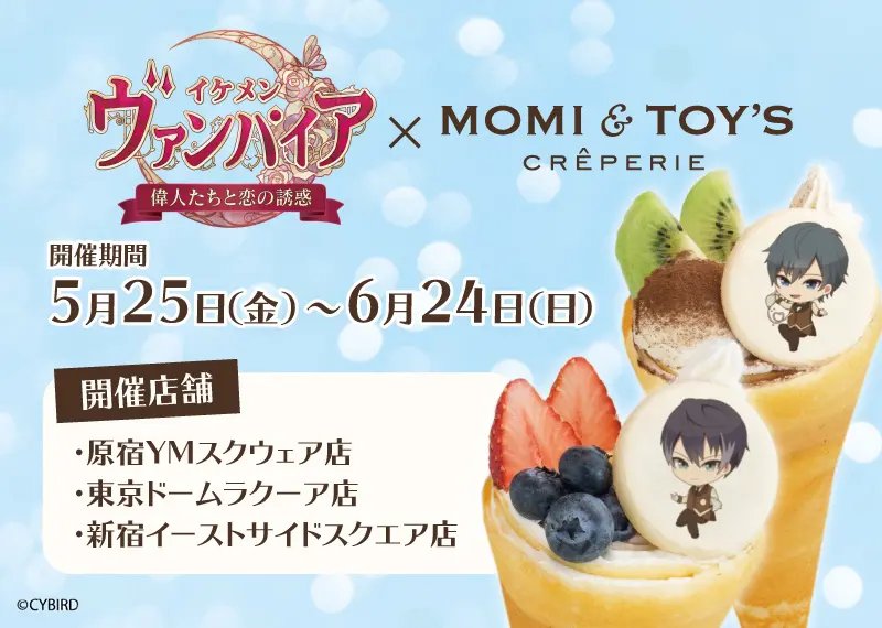 『イケメンヴァンパイア◆偉人たちと恋の誘惑』では、ふんわりサクサクした生地が特徴の「とろけるクレープ」を販売する「MOMI&TOY’S(モミアンドトイズ)」と、2018年5月25日(金)から6月24日(日)の期間限定で、コラボレーションを実施します。