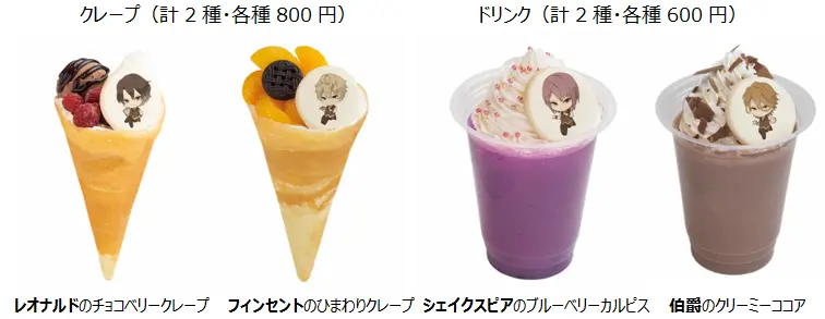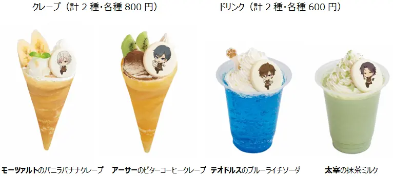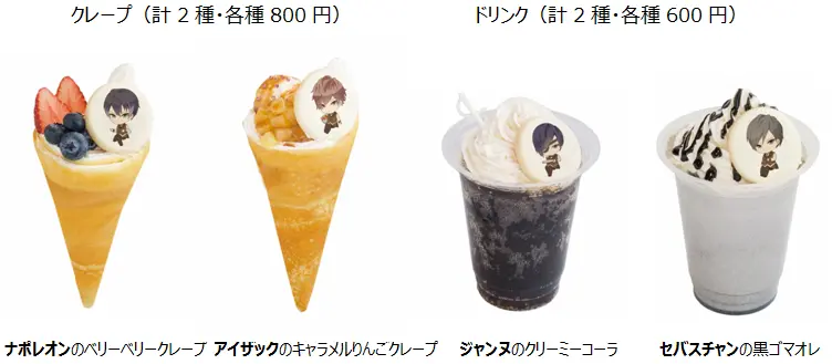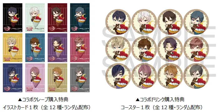 今回のコラボレーションでは、本アプリに登場するキャラクターをイメージした限定クレープやドリンクを、「MOMI&TOY’S(モミアンドトイズ)」の都内3店舗(新宿イーストサイドスクエア店・東京ドーム ラクーア店・原宿YMスクウェア店)にて販売します。各店舗でお楽しみいただけるメニューが異なります。また、コラボメニューの購入特典として、オリジナルイラストカードや、オリジナルコースターをプレゼント。そのほか、コラボ実施を記念して、オリジナルA4クリアファイル(非売品)がもらえるスタンプラリー企画も実施します。