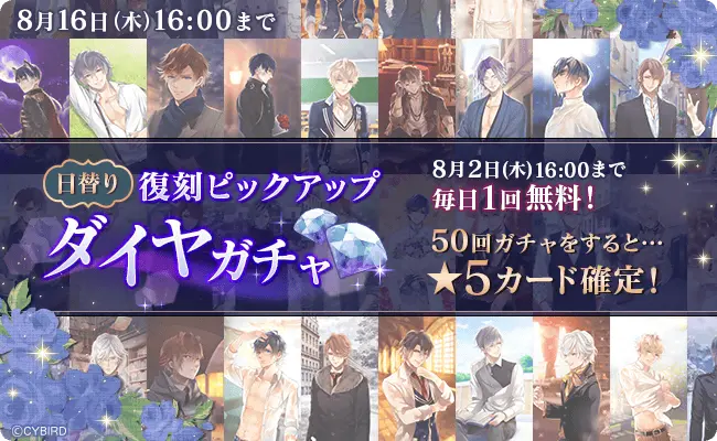 これまで期間限定で登場した彼カードが復刻する「復刻ピックアップダイヤガチャ」を、7月21日(土)より開催します。日替りで確率アップするキャラクターが変わり、、8月2日(木)16時までは特別に毎日1回無料でガチャを回すことができます。50回ガチャを回すと、必ず★5彼カードが1枚確定となります。