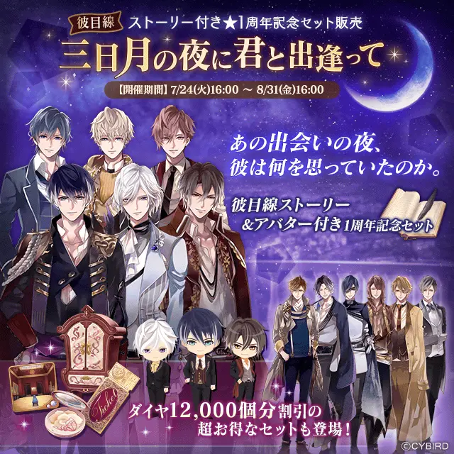 あなたとの出会いの夜を、彼目線で振り返る特別ストーリーと、1周年礼服ミニキャラアバターが付いた豪華1周年記念セット「三日月の夜に君と出逢って」を販売します。