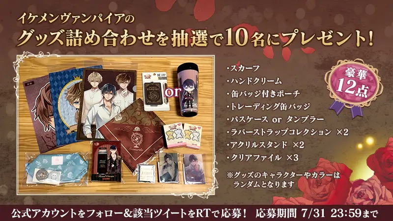 本アプリの公式Twitter(https://twitter.com/IkemenVampire)をフォローの上、該当ツイートをリツイートするだけで、豪華グッズを詰め合わせた1周年記念福袋を、抽選で10名様にプレゼントします。