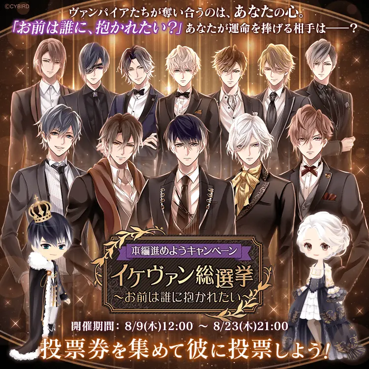 本アプリにおいて初開催となるキャラクター総選挙「イケヴァン総選挙~お前は誰に抱かれたい~」を、本日2018年8月9日(木)から8月23日(木)の期間限定で開催します。アプリにログインしたり、ストーリーを読み進めたりすることで、投票券を集め、お気に入りの彼に投票することができます。