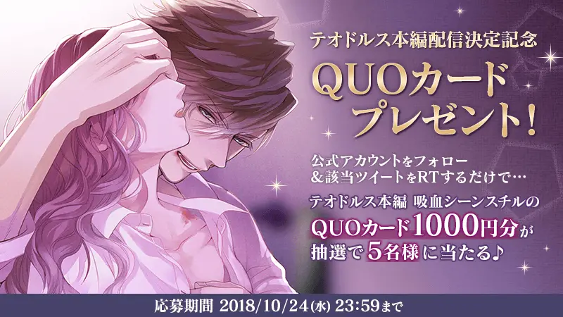 本編ストーリー配信を記念し、本アプリの公式Twitter(@IkemenVampire)をフォローの上、対象ツイートをリツイートいただくと、吸血シーンのスチルが描かれたQUOカード(1,000円分)を抽選で5名様にプレゼントします。