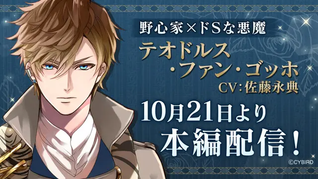 佐藤 永典氏がCVを務める、野心家×ドSな悪魔”テオドルス・ファン・ゴッホ“の本編ストーリーを、2018年10月21日(日)16時より配信開始します。また、”テオドルス・ファン・ゴッホ“本編のスチルやボイスが楽しめるあらすじ動画、「テオドルス・ファン・ゴッホ 本編ダイジェストPV」も絶賛公開中です。