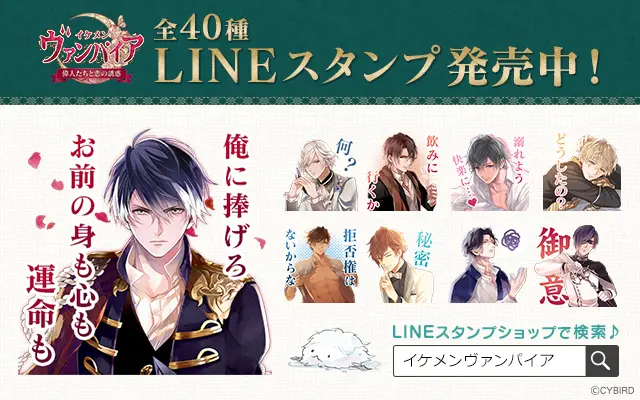『イケメンヴァンパイア◆偉人たちと恋の誘惑』初のLINEスタンプです。ゲームに登場する12人の偉人たちによる素敵なセリフとデザインのスタンプを是非お楽しみください。
