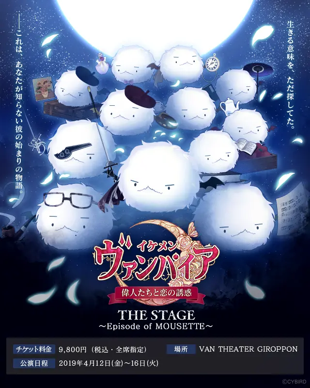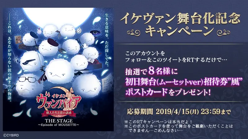 「イケメンヴァンパイア◆偉人たちと恋の誘惑 THE STAGE ~ Episode of mousette ~」はエイプリルフール企画のため、実際の公演はございません。但し以下のTwitter RTキャンペーンは本当に実施します。