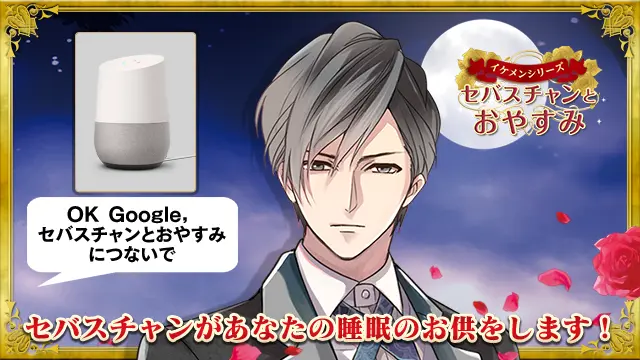 Googleが提供する「Google アシスタント」において、課金型サービス『セバスチャンとおやすみ』の提供を開始しました!音声で操作でき、常にハンズフリーで利用できるスピーカー「Google Home」に「OK Google, セバスチャンとおやすみを始めて」と話しかけるだけで、セバスチャンが「おやすみ」「おはよう」に優しく応答してくれたり、甘いボイスで「添い寝」をしてくれたりします。