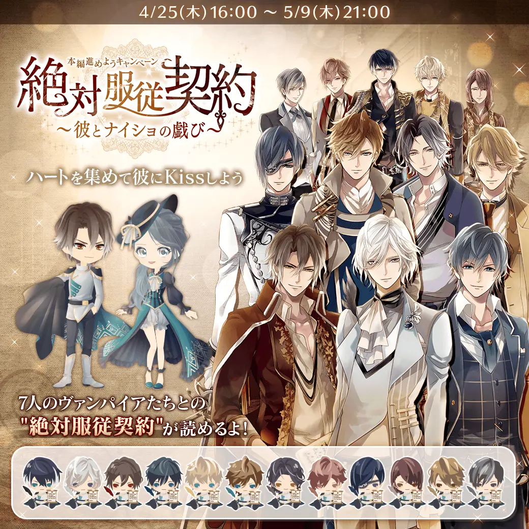 ジャンヌ・ダルク本編ストーリー配信に合わせ、アプリ内では本編進めようキャンペーン「絶対服従契約~彼とナイショの戯び~」を開催します。本編を読み進めたり、期間中ログインすることでもらえる「ハート」の数に応じて、さまざまなアイテムをゲットでき、ジャンヌ・ダルクを含む彼たちの特別ストーリーを読むことが出来ます。ぜひこの機会にキャンペーンへ参加してみてください。