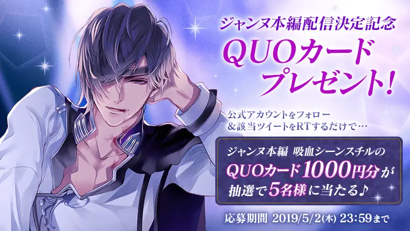 ジャンヌ本編配信決定記念として、公式Twitter(http://urx2.nu/SAuQ)をフォローのうえRTいただくと、吸血シーンスチルのQUOカード(1000円分)が抽選で【5名様】に当たります。
