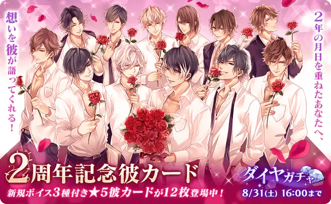 アプリ内では、2周年記念企画として期間限定ログインボーナスや限定ガチャメダルが最大30枚もらえるキャンペーンなどを開催中です。その他にも2周年ifイベント「もう一度、君に恋をする」や2周年メインビジュアル彼カードダイヤガチャ、2周年コーデガチャなど、2周年に向けた企画を実施しています。