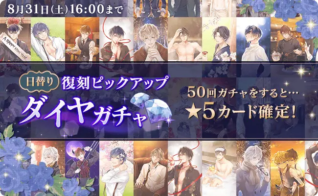 これまで期間限定で登場した彼カードが復刻する「復刻ピックアップダイヤガチャ」を、7月31日(水)より開催します。日替りで確率アップするキャラクターが替わり、50回ガチャを回すと★5彼カードが1枚確定となります。