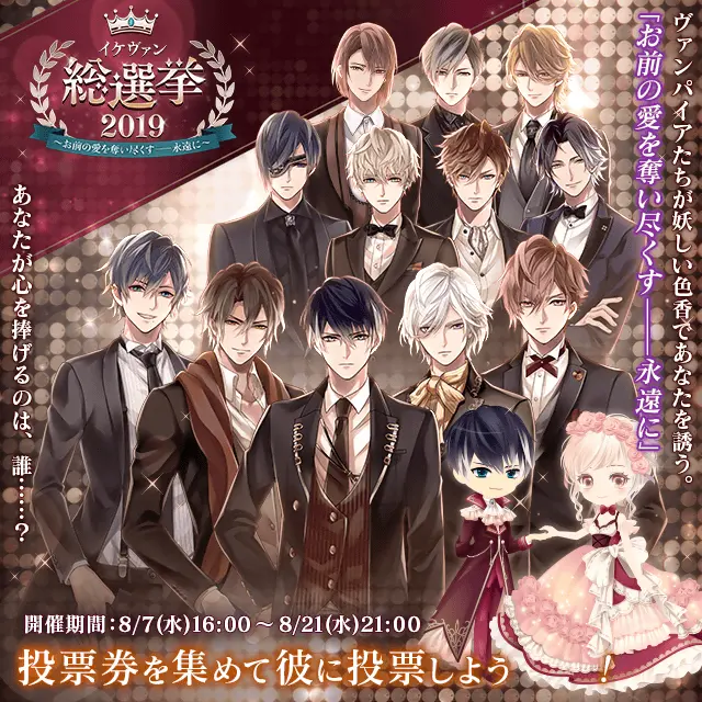 昨年大好評だった、「イケヴァン総選挙」を今年も2019年8月7日(水)16:00から8 月 21 日(水)21:00まで開催します。開催に先がけ、特設ページをアプリ内で7月31日(水)12:00より公開しています。本総選挙では、総投票数を競う「総合ランキング」の他に、甘やかされたい男/罵られたい男/抱かれたい男の 3 部門に分かれた「部門別ランキング」があります。投票したキャラクターがランキング上位に輝くと、豪華な企画が実施されます。