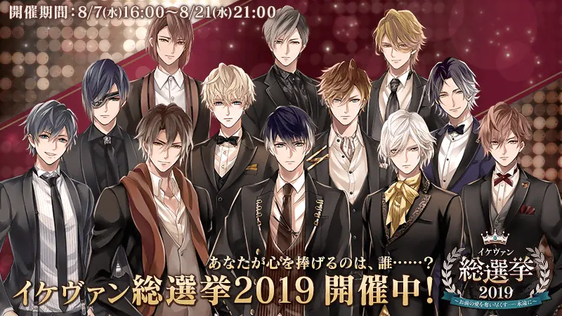 昨年大好評だった、「イケヴァン総選挙2019~お前の愛を奪い尽くす―永遠に」を、本日2019年8月7日(水)から8月21日(水)の期間限定で開催します。今年のテーマは”男の色気”。12人の頂点に立つ偉人は誰なのか?あなたの1票で彼らの運命が決まります。本総選挙では、総投票数を競う「総合ランキング」の他に、甘やかされたい男/罵られたい男/抱かれたい男の 3 部門に分かれた「部門別ランキング」があります。投票したキャラクターがランキング上位に輝くと、豪華な企画が実施されます。