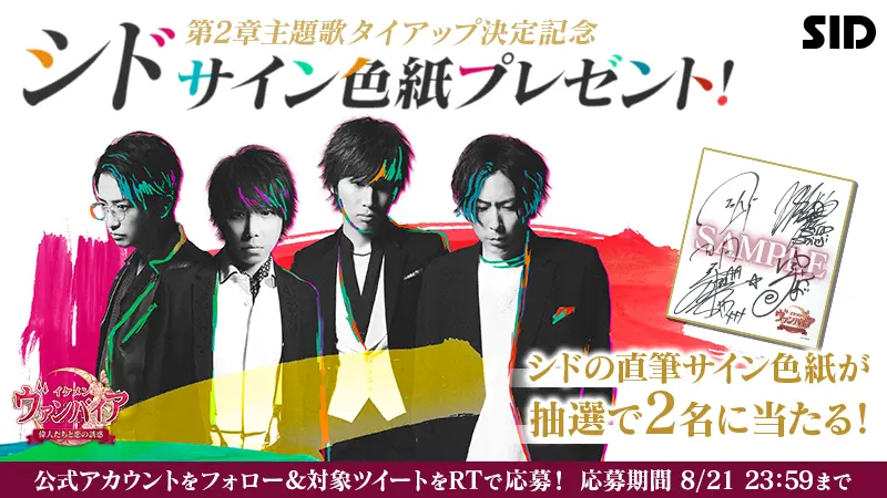 第2章発表を記念したTwitterキャンペーン第2弾を、2019年8月7日(水)16:00 から8月21日(水)23:59まで実施します!第2弾キャンペーンでは公式Twitter (http://ur0.work/UJ0z)をフォローのうえ該当ツイートをRTいただくと、シドの直筆サイン色紙が抽選で【2名様】に当たります。