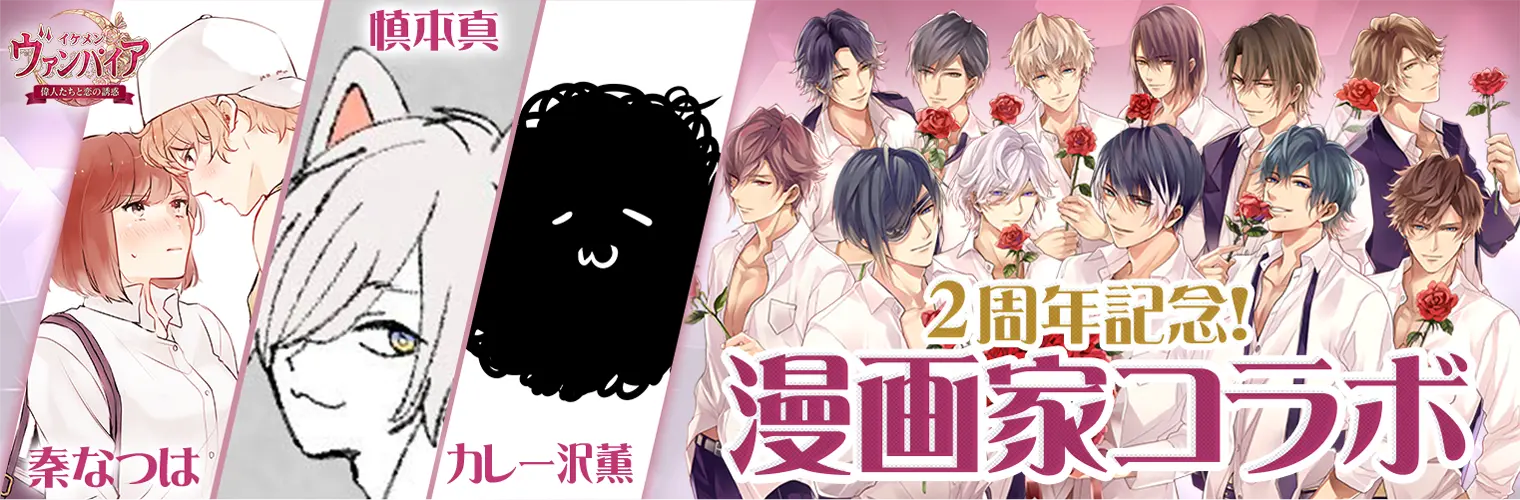 イケメンヴァンパイア2周年を記念して、本日8月26日(月)より本作公式サイトの「2周年特設サイト」では、秦 なつは先生、慎本 真先生、カレー沢 薫先生の豪華作家陣によるイケヴァンのキャラや世界観の魅力を描いた漫画3作品を公開しています。3人の先生たちが、それぞれの視点で描くイケヴァンの世界を是非ご覧ください!