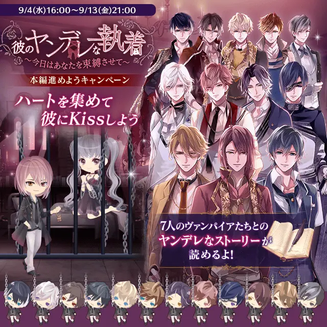 ウィリアム・シェイクスピア本編ストーリー配信に合わせ、アプリ内では本編進めようキャンペーン「彼のヤンデレな執着~今日はあなたを束縛させて~」を、2019年9月4日(水)16:00 ~ 9月13日(金)21:00まで開催します。