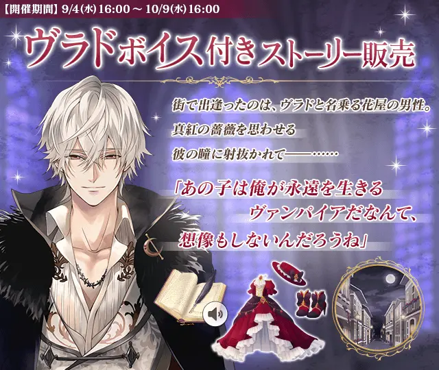 若手実力派声優「斉藤 壮馬」さん演じる、新キャラクター「ヴラド」のボイス付きストーリーを販売します。ヴラドと主人公との「出逢い」を描いたストーリーを、第2章に先駆けてぜひチェックしてみてください。