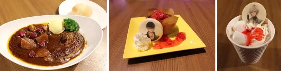 さがみ湖イルミリオンのレストラン「ワイルドダイニング」では、イケメンヴァンパイアをイメージしたコラボフードも限定販売します。メインにはバラの花びらを散らした可憐な「花びら舞い散るハンバーグシチューセット パン付(ランダムポスター付)」、デザートの「愛がとろけるフォンダンショコラ(ランダムクッキー付)」、ドリンクの「ルージュホットココア(ランダムクッキー付)」を販売予定です。