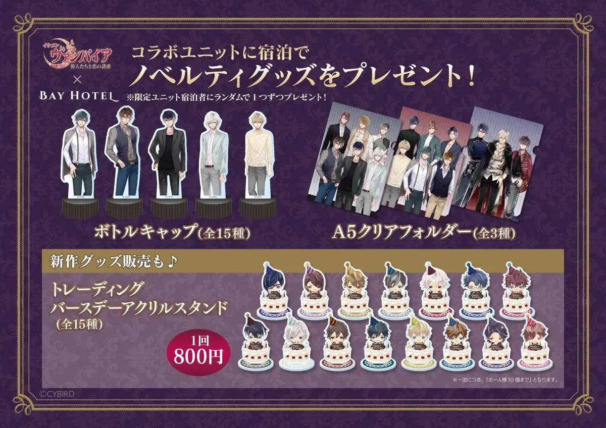 また、宿泊した方には、アクリルスタンド付ボトルキャップ1個(全15種・ランダムでのプレゼント)と、A5サイズクリアファイル1枚(全3種・ランダムでのプレゼント)の2種類のノベルティグッズがもれなくプレゼントされます。