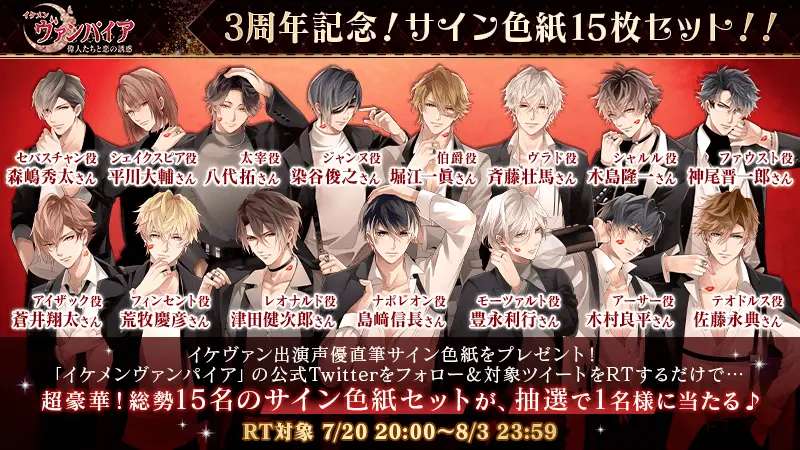 (https://twitter.com/ikemenvampire)をフォローのうえRTいただくと、『イケメンヴァンパイア◆偉人たちと恋の誘惑』出演声優全員の直筆サイン色紙15枚セットが抽選で【1名様】に当たります。
