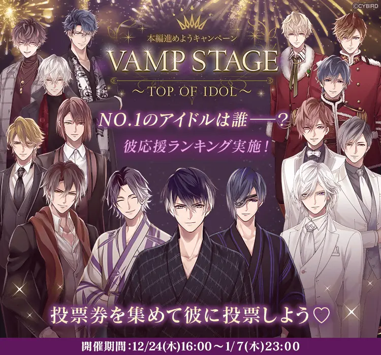 「ヴラド本編」ストーリー配信に合わせ、アプリ内では本編進めようキャンペーン「VAMP STAGE~TOP OF IDOL~」を、2020年12月24日(木)16:00~ 1月7日(木)23:00まで開催します。
