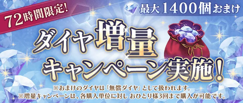 対象期間中にダイヤを購入すると、おまけダイヤが付いてくる「ダイヤ増量キャンペーン」を開催します。