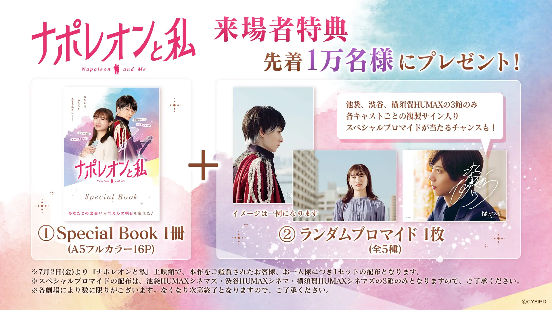 公開に合わせ、先着1万名様に来場者特典を配布することが決定しました。『ナポレオンと私』Special bookとランダムブロマイド1枚をセットでプレゼントします。また、劇場限定での施策も多数実施します。