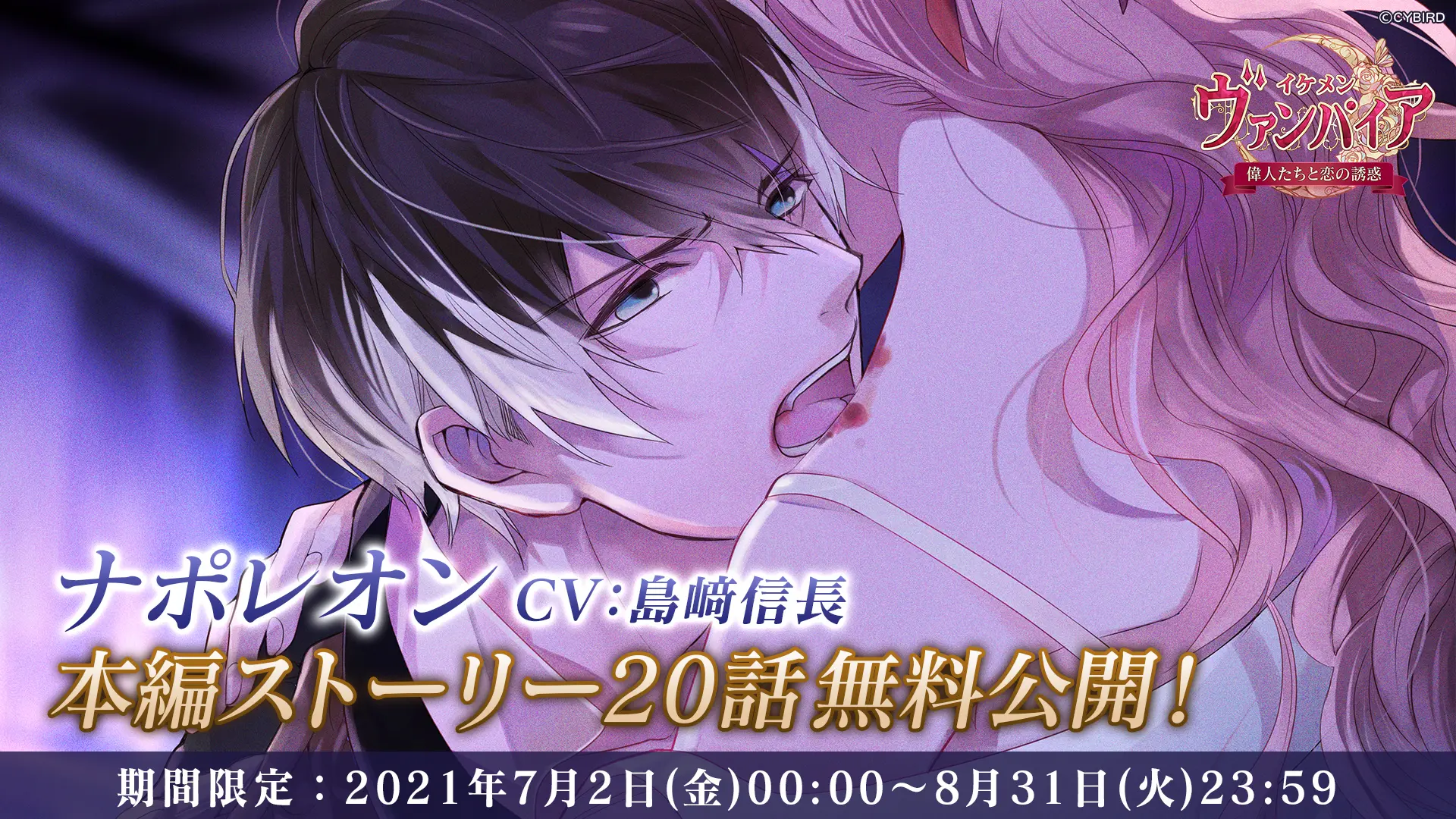 『イケメンヴァンパイア◆偉人たちと恋の誘惑』のスピンオフ映画『ナポレオンと私』の公開を記念し、アプリ内にて、映画にも登場する大人気キャラクター「ナポレオン・ボナパルト(CV:島﨑信長)」の本編ストーリー20話を期間限定で無料公開します。映画、アプリを通してカリスマ×俺様な「ナポレオン・ボナパルト(CV:島﨑信長)」をぜひご堪能ください。本編ストーリーは、アプリ内の『ナポレオンと私』告知ページよりお楽しみいただけます。