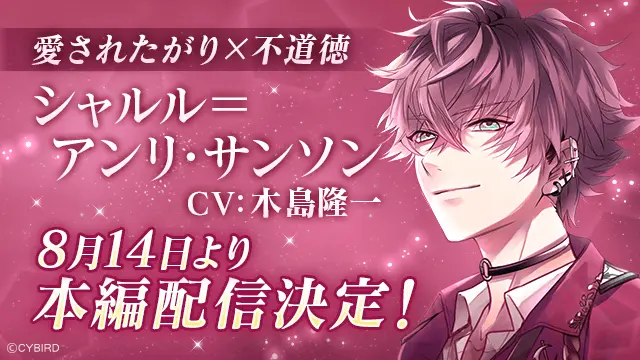 『イケメンヴァンパイア◆偉人たちと恋の誘惑』では、木島 隆一さんがCVを務める、愛されたがり×不道徳な「シャルル=アンリ・サンソン」の本編を、8月14日(土)より配信開始します。「シャルル=アンリ・サンソン」の本編配信をもって、2019年冬より始まった禁断の第2章は完結となります。