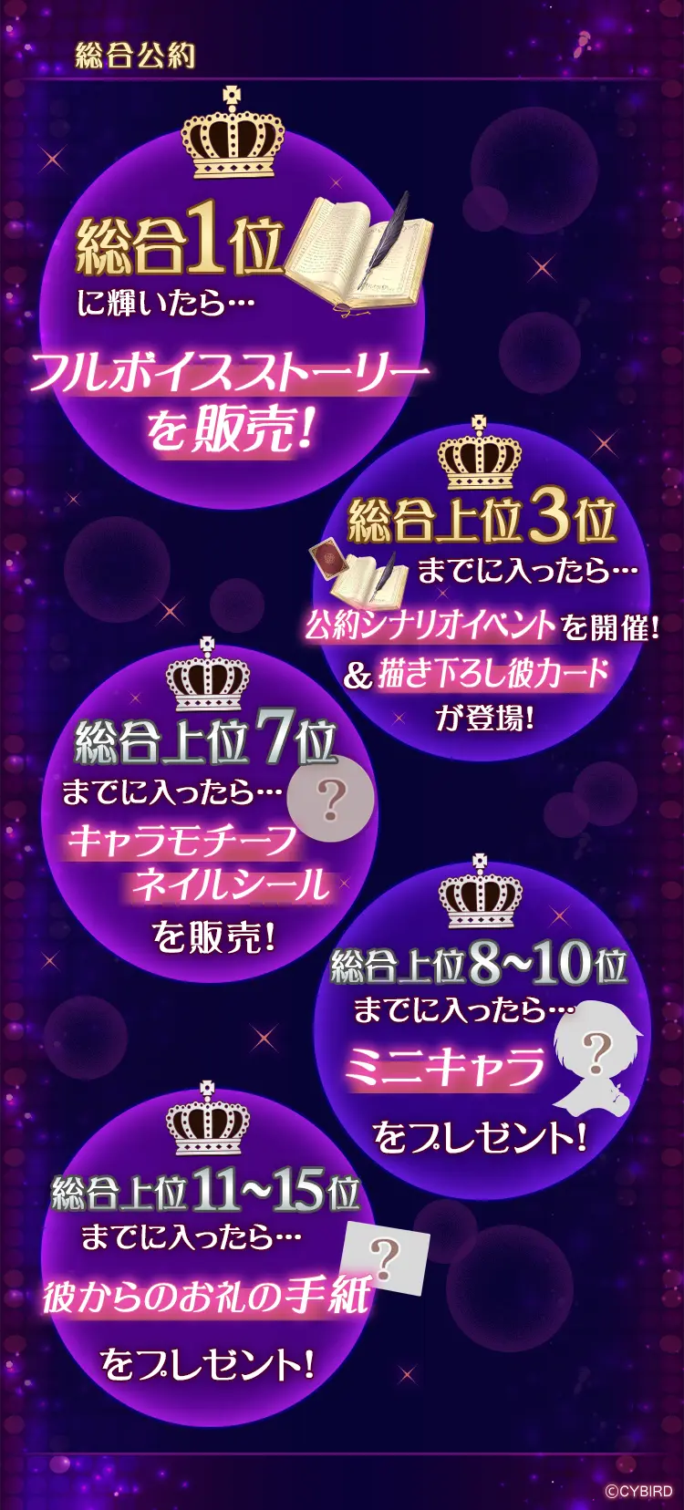 今年の総合ランキング1位に輝くと、なんとフルボイスシナリオの販売が実現します。また、総合ランキング3位以内に入ったキャラクターにおいては、新規の描き下ろしイラストを含んだシナリオイベントを開催します。
