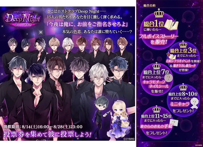 今年の総合ランキング1位に輝くと、なんとフルボイスシナリオの販売が実現します。また、総合ランキング3位以内に入ったキャラクターにおいては、新規の描き下ろしイラストを含んだシナリオイベントを開催します。