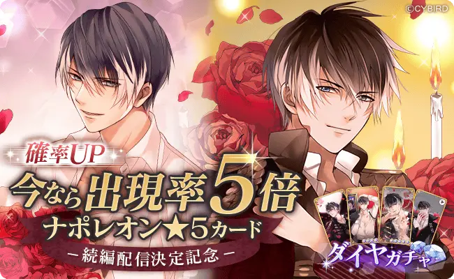 「ナポレオン・ボナパルト」の周年ビジュアルを含む、美麗彼カードがダイヤガチャに登場します。開催期間中は、「ナポレオン・ボナパルト」の星5彼カード6枚の出現率が上がっていますので、ぜひこの機会に手に入れてください。
