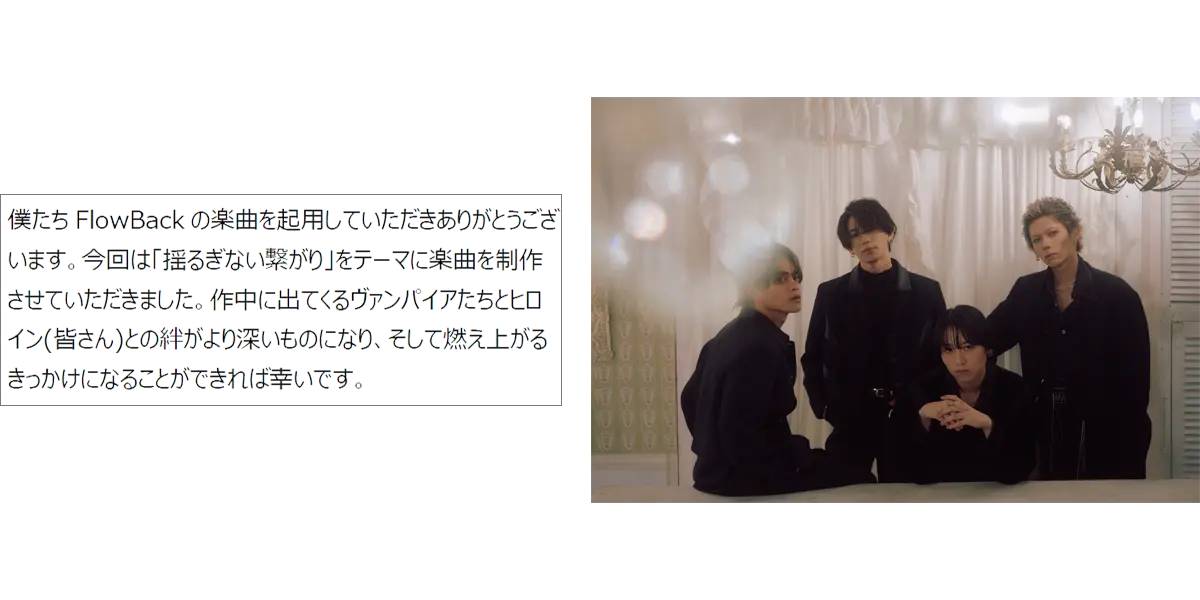 4人組ダンス&ボーカルグループ「FlowBack」が歌う『イケメンヴァンパイア◆偉人たちと恋の誘惑』6周年記念ソング「Rose」のMVを、特設サイトにて公開しました。「Rose」は、彼とあなたの、溺れるような甘く激しい恋愛が綴られた楽曲です。