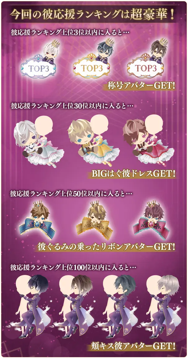 彼応援ランキング上位100位以内に入ると「頬キス彼アバター」を獲得することができます。