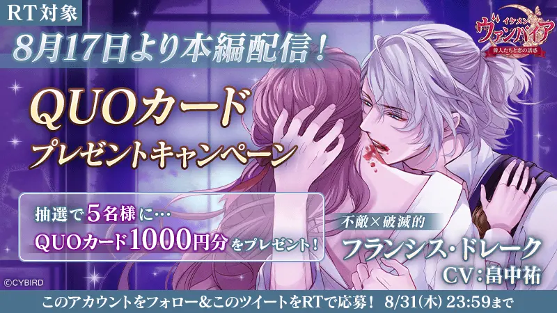 「フランシス・ドレーク(CV:畠中 祐)」の本編配信を記念して、公式Twitter(https://twitter.com/ikemenvampire)をフォローのうえ該当のツイートをRTいただくと、本編スチルシーンを使用したQUOカード(1,000円分)が、抽選で【5名様】に当たります。