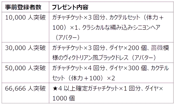 『イケメンヴィラン 闇夜にひらく悪の恋』の公式サイト、公式LINE、公式Twitter、イケメンシリーズファンクラブのいずれかにおいて事前登録いただいたお客様に向けたキャンペーンを開催します。事前登録数に応じて最大10回分のガチャチケットやダイヤ1500個など豪華アイテムがもらえるキャンペーンとなります。