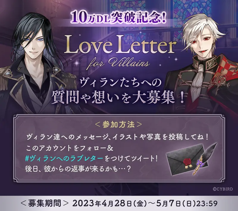 10万ダウンロード突破を記念し、公式Twitter(<a href=”https://twitter.com/Ikemen_Villains”>https://twitter.com/Ikemen_Villains</a>)にて、9人のヴィラン達への質問や想いを募集する「Love Letter for Villains」を開催します。アカウントをフォローのうえ「#ヴィランへのラブレター」をつけて彼らへの質問や思いを投稿してください。投稿した方の中から抽選で、後日彼から返事が貰えるかも……?<br>