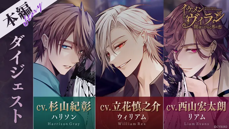 『イケメンヴィラン 闇夜にひらく悪の恋』10万ダウンロード突破を記念し、現在ストーリーが配信されている、「ウィリアム・レックス」(CV:立花 慎之介)、「ハリソン・グレイ」(CV:杉山 紀彰)、「リアム・エヴァンス」(CV:西山 宏太朗)の本編あらすじをイラストやボイス付きでお楽しみいただける、本編ダイジェストPVを公開しました。PVを見て、本編ストーリーをぜひご堪能ください。