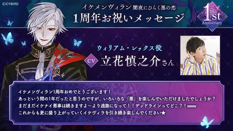 「ウィリアム・レックス」役の立花 慎之介さんから1周年のお祝いメッセージをいただきました。