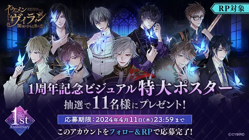 1周年を記念して、公式X(https://twitter.com/Ikemen_Villains)にて、抽選で11名様に イラストレーター・夏目レモン先生が手掛けた『イケメンヴィラン』の1周年記念ビジュアル特大ポスターが当たるフォロー&RPキャンペーンを実施します。