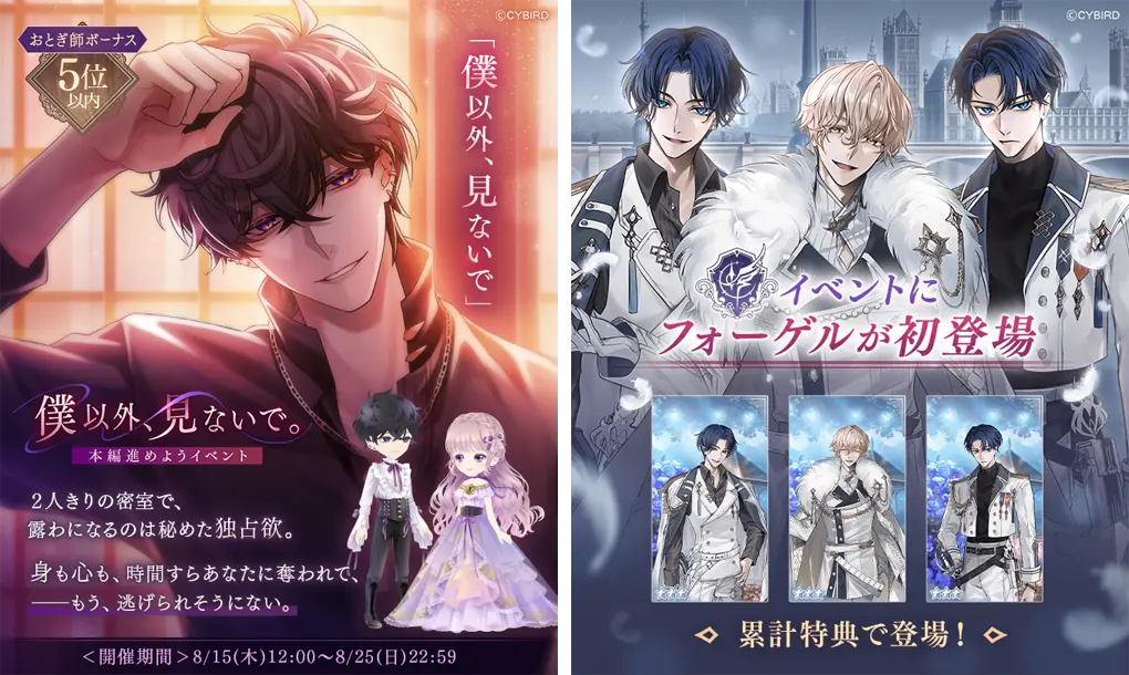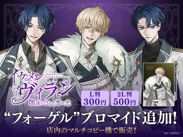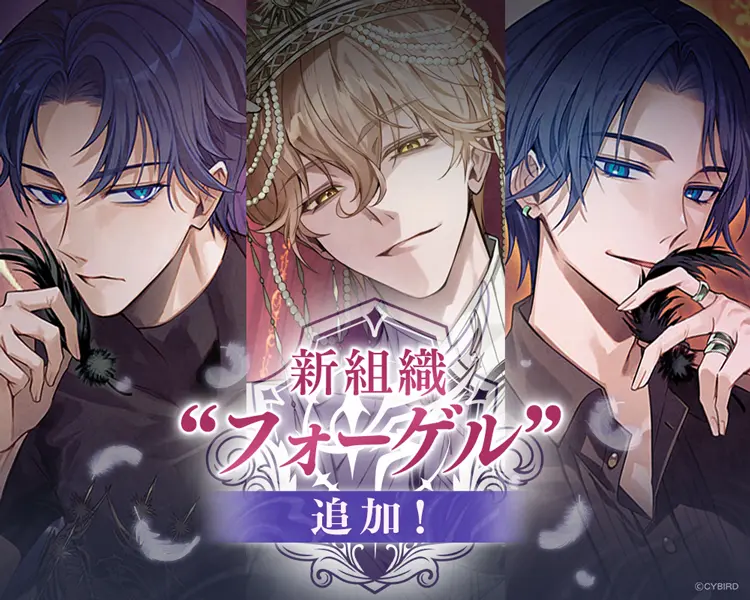『イケメンヴィラン 闇夜にひらく悪の恋』において、2024年8月15日(木)より第2章に登場する新組織“フォーゲル”の3名、「ダリウス・フォーゲル」(CV:重松 千晴)、「ニカ・シュワルツ」(CV:柿原 徹也)、「リン・シュワルツ」(CV:田邊 幸輔)がアプリ内の「ガチャ」や「コミュ」機能に追加されました。