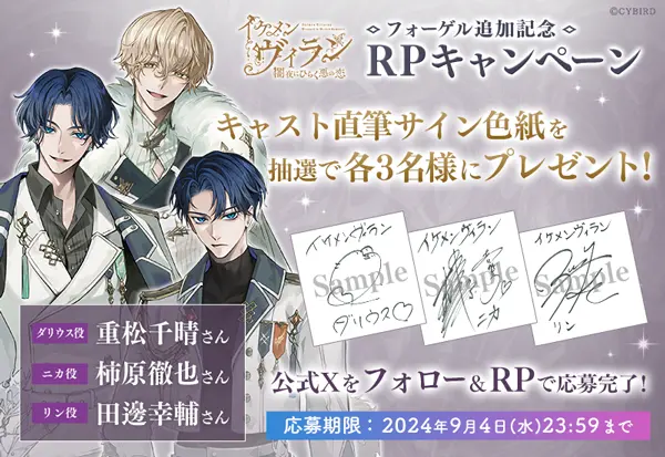 『イケメンヴィラン』公式Xにて、「ダリウス・フォーゲル」役・重松 千晴さん、「ニカ・シュワルツ」役・柿原 徹也さん、「リン・シュワルツ」役・田邊 幸輔さんの直筆サイン色紙が当たるRPキャンペーンを開催しています。直筆サイン色紙は抽選で各3名様にプレゼントします。