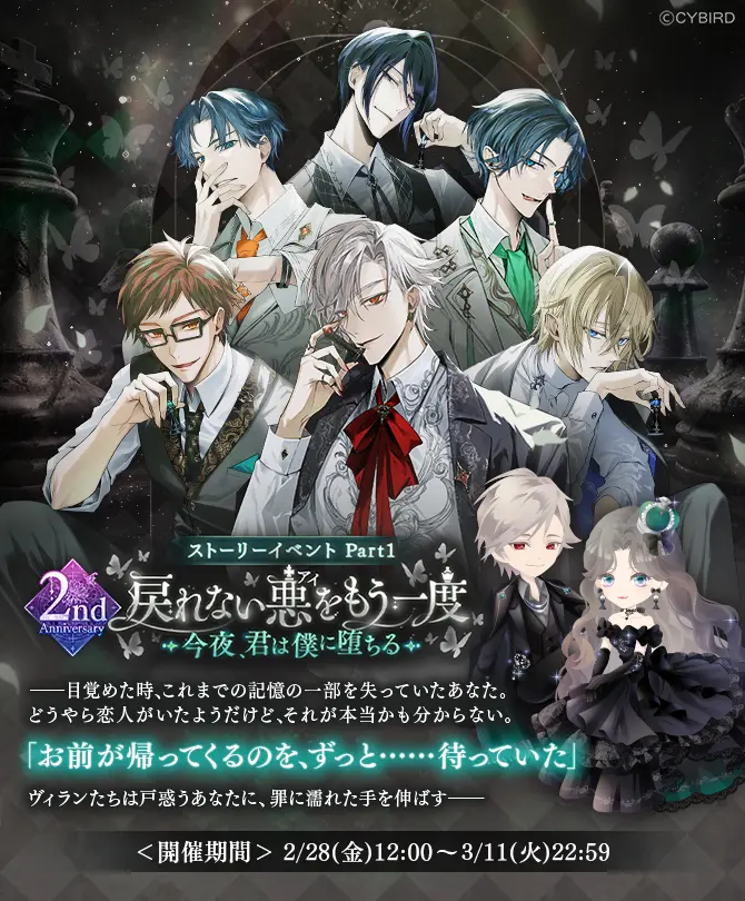 2周年を記念して開催する、ストーリーイベント「戻れない悪(アイ)をもう一度~今夜、君は僕に堕ちる~」では、12人の全ヴィランがPart1,2に分かれて登場します。2周年の節目を飾る特別なイベントストーリーをぜひお楽しみください。
