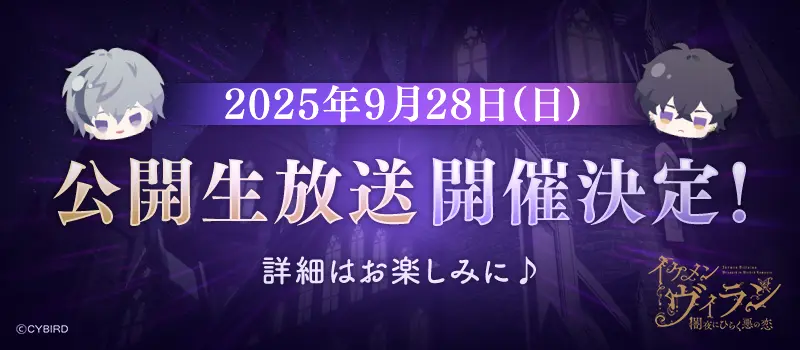 お客様をお招きする公開生放送イベントの開催が2025年9月28日(日)に決定しました。イベントの様子は生放送番組「イケメンヴィラン生放送 ヴィラなま」としてイケメンシリーズ公式YouTubeチャンネルにて配信します。
