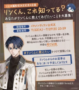 さらに、『イケメンヴィラン』公式X(https://x.com/Ikemen_Villains)では、ハッシュタグをつけて投稿すると「リン・シュワルツ」から返事がもらえる、「リン本編配信決定記念X企画 リンくん、これ知ってる?」の実施が決定しました。
